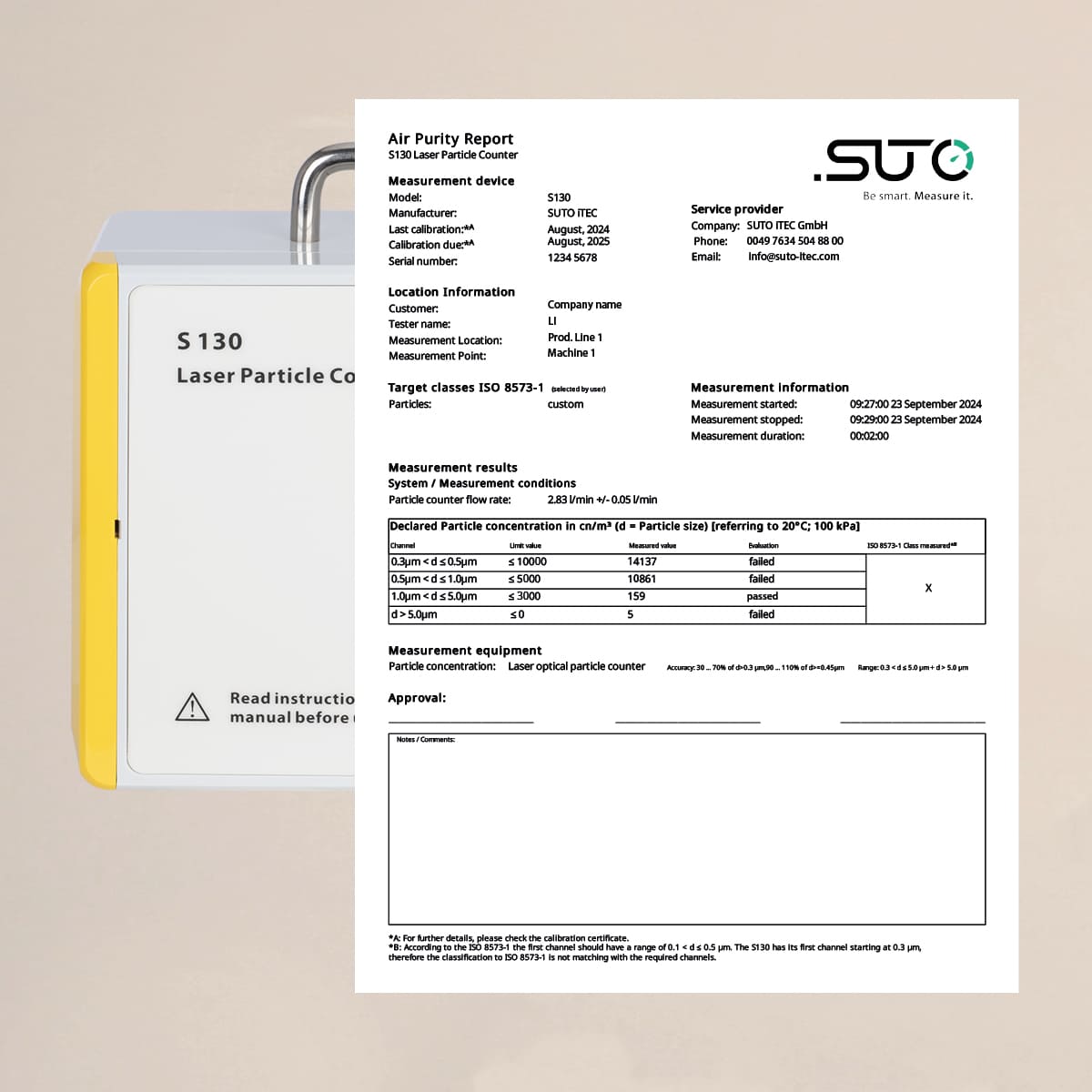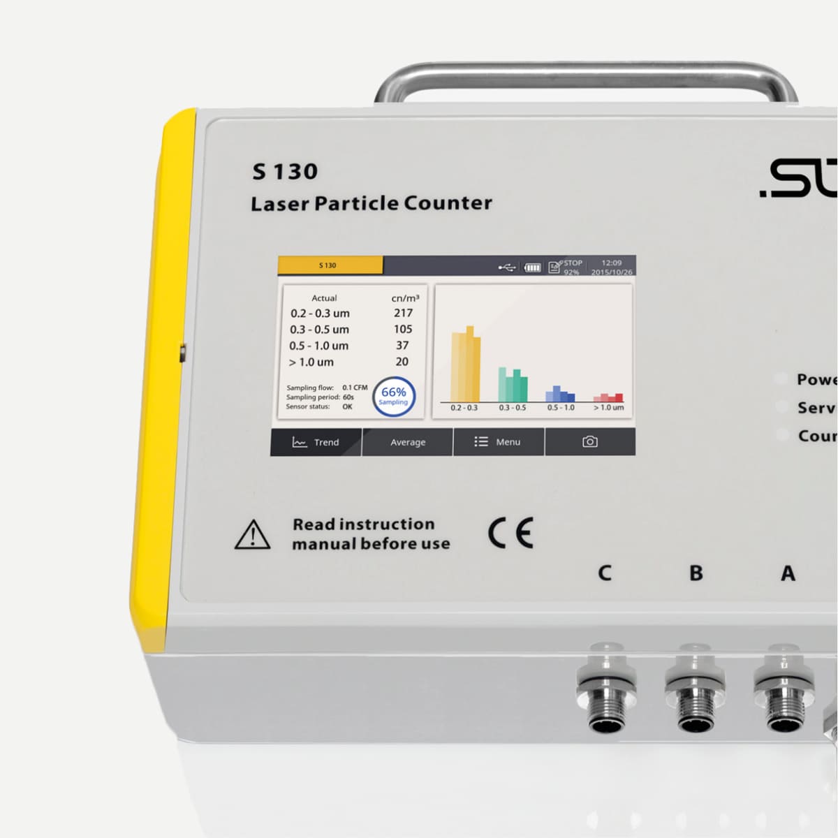 When equipped with the optional 5″ touch display, the S130 provides real-time visualization of all particle channels, intuitive navigation, and easy data export. The integrated data logger can store up to 30 million values, enabling long-term monitoring and traceability of compressed-air quality.