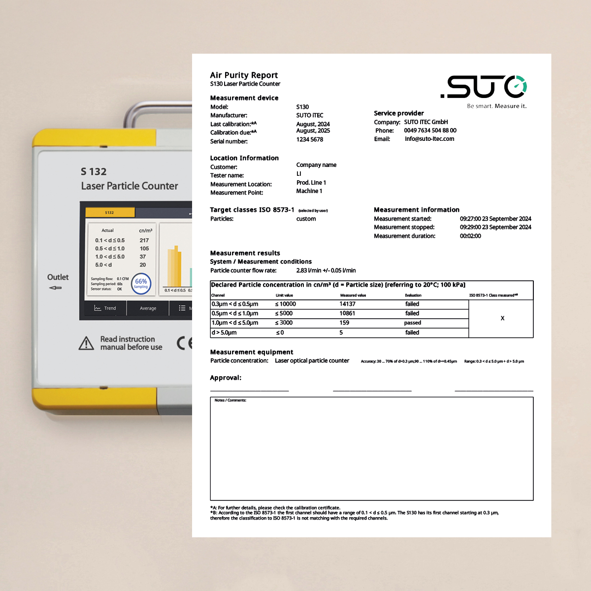 The S132 is the high-performance version of SUTO iTEC’s laser particle counter series, designed for critical applications where the smallest particles matter. It measures particle sizes from 0.1 to 5.0 µm, offering unmatched precision for compliance with ISO 8573-1 and ISO 8573-4 standards.
