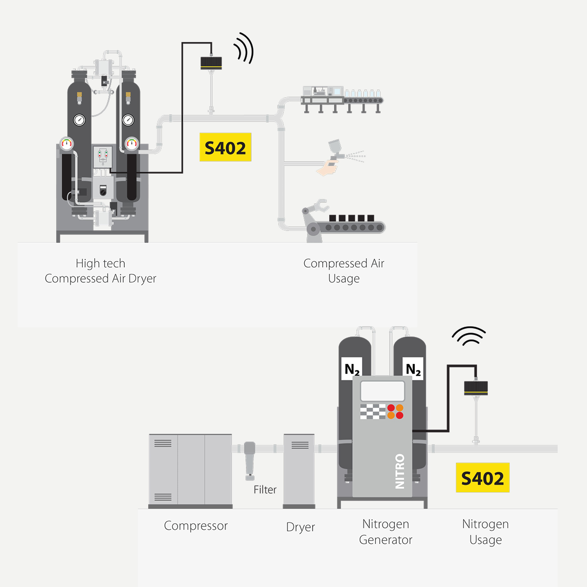 The S402 OEM flow sensor offers reliable flow and consumption measurements for driers and consumers. Insertion type sensor fits to all pipe sizes.
